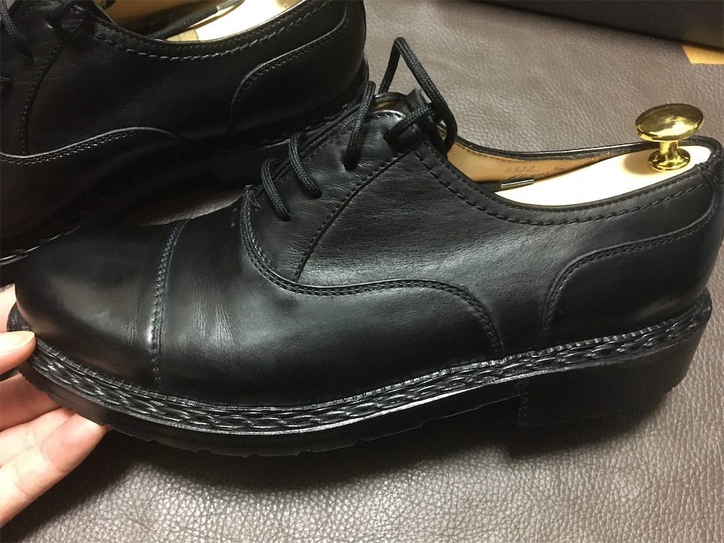 シュプリームクリームならもうちょっとツヤが出てもいいかなーと思ったんですが、たぶんまだ新しい靴なのでそこまでですかね。もうちょっと履き込んで手入れ重ねていけば、ブラッシングだけでいい感じに光りそうなポテンシャルを秘めています。