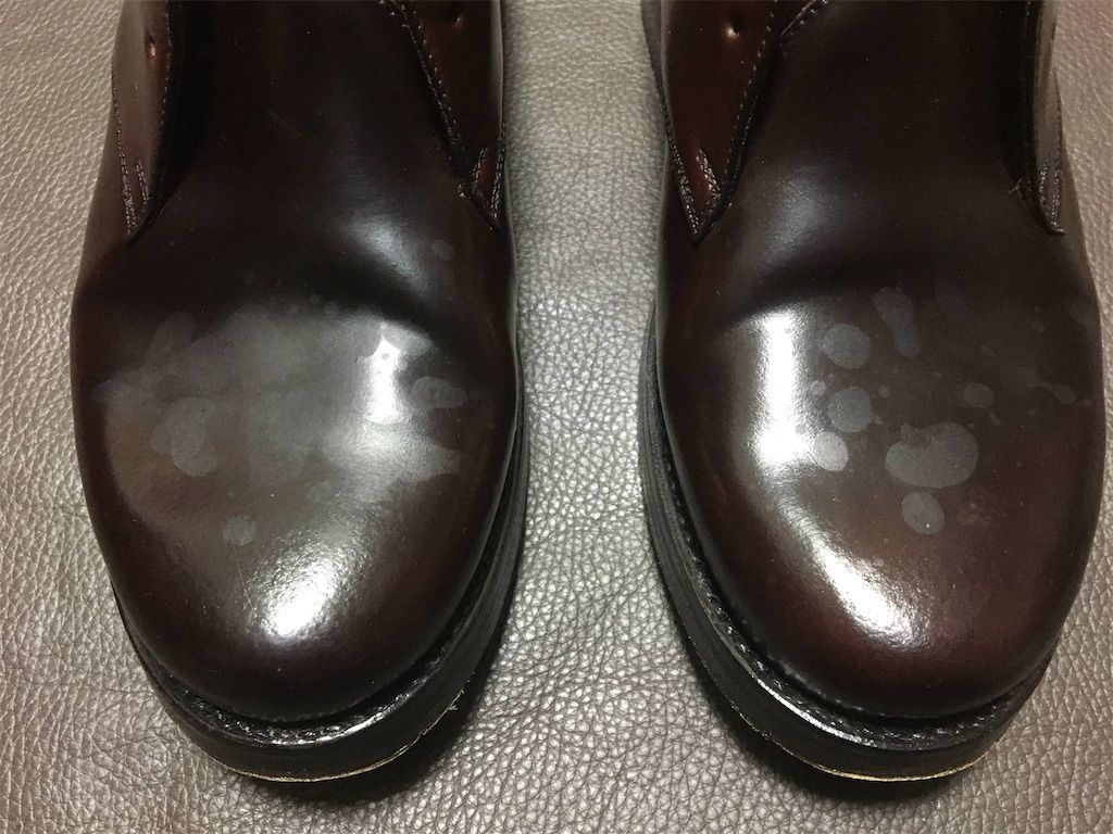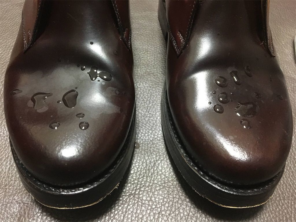 結果はなんとほぼ同じ。笑 首藤式コードバン防水もシュプリームクリーム仕上げも、両方水滴跡は残るもののどちらも馬毛のブラッシングでキレイサッパリ跡が消えるという結果となりました。