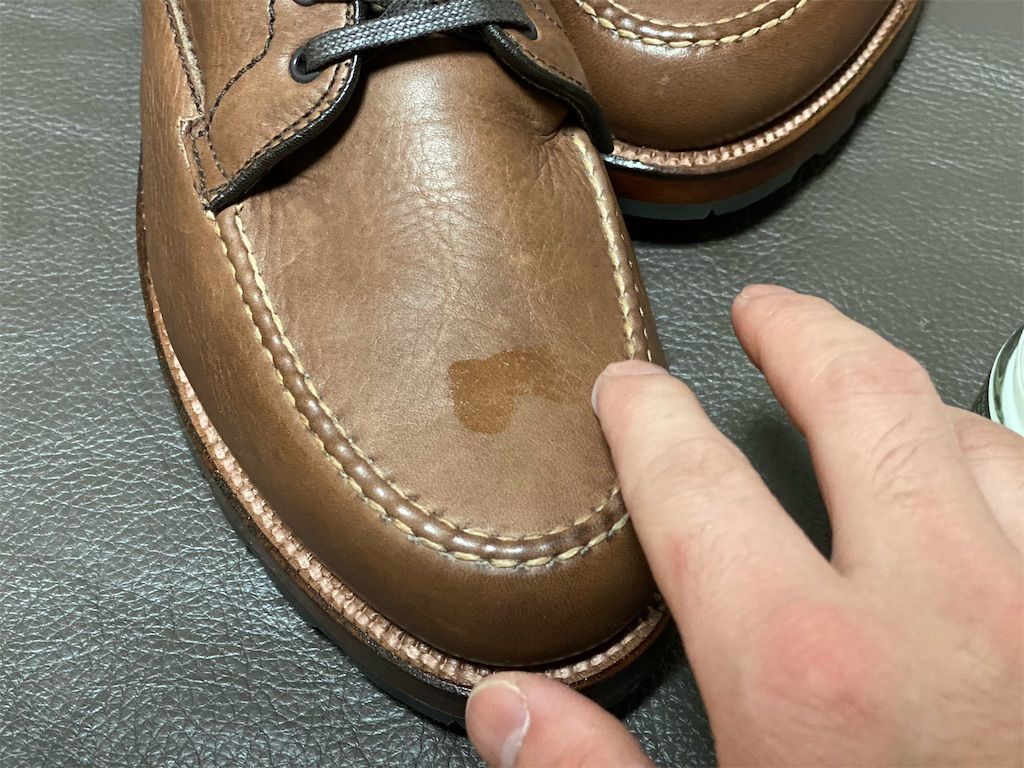 ちなみにミシガンブーツに使われているユティカに関しては、通常のカーフみたいにバリバリ仕上げ剤が塗られてるようなレザーでもなさそうなので、ステインリムーバーでの汚れ落としはやってません。首藤の独断と偏見です。大丈夫そう。