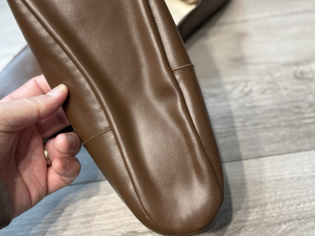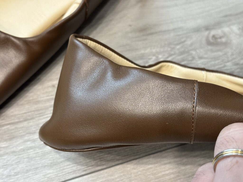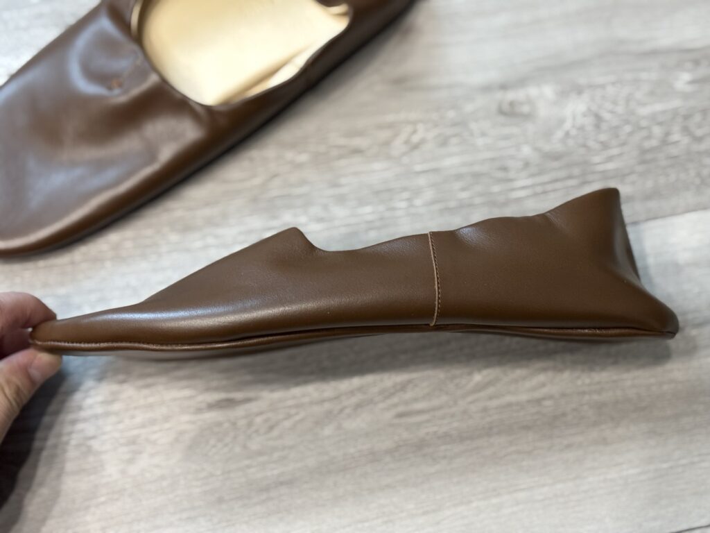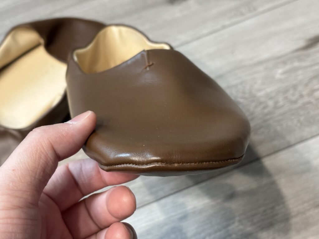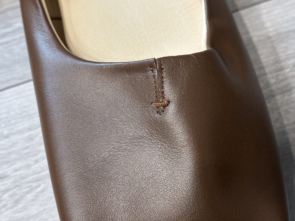 Shoe Place byのバブーシュのディテール的特徴として、この甲の切り込みと革靴由来のシャコ止めが挙げられるかなと思いますよ。