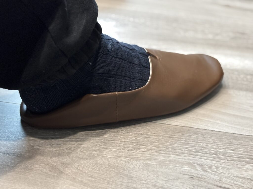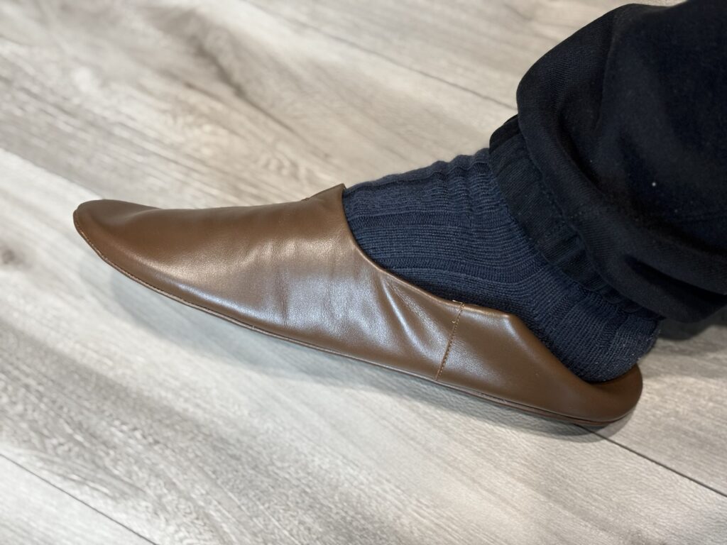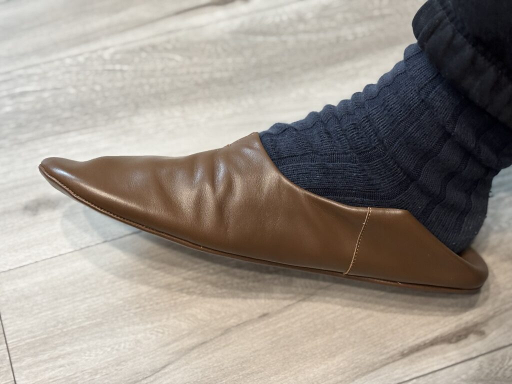 これはもう100均やホームセンターのスリッパでは得られない感覚ですよね。そして何よりビスポークブランドが作るバブーシュってこともあって、テンション的にも満足度が高いです。